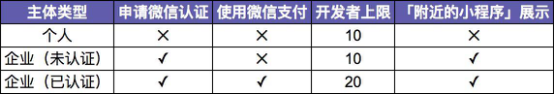 开发者人数除了微信支付的权限不同外,经过微信认证的小程序,还可以绑定最多 20 位小程序的开发者。未通过微信认证的小程序,最多只能绑定 10 位开发者。